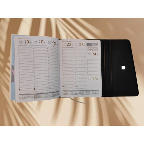 Agenda semanal del año 2026 Remember 3, tapa acolchada con costuras artesanales, solapa interiorcon tarjeteros y tapa exterior con solapa y broche inmantado