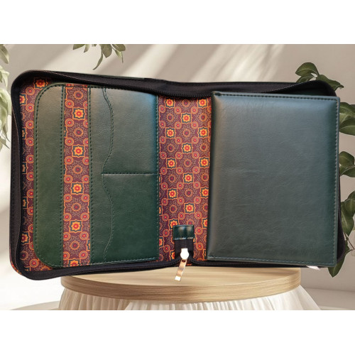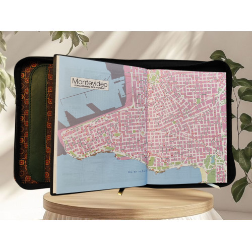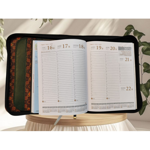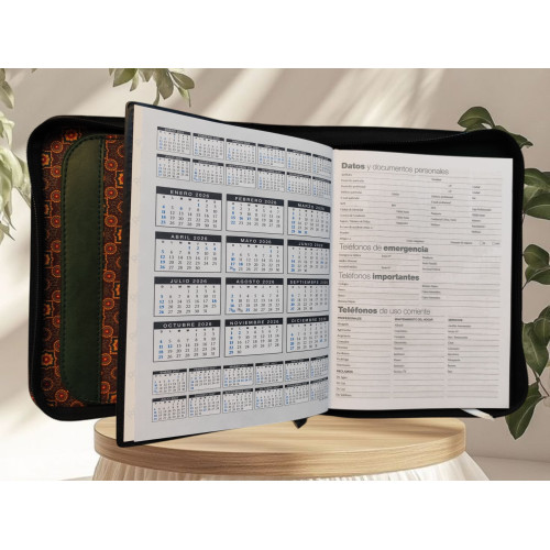 Agenda Remember 3 del 2026 semanal tapa con dossier forrado en seda estampada, con cierre de cremallera, contratapa interior con fuelle, tarjeteros y costuras artesanales.