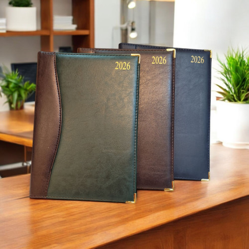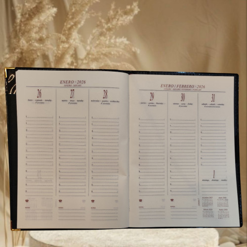 Agenda Abezeta Presidente del año 2026 tapa cosida a hilo acolchada con esquineros. semana a la vista. Medida total 21 cms. x 28 cms. Personalizamos tu agenda, imprimimos el logo de tu empresa, consultanos precio por cantidad o para presupuestar el regalo empresarial que necesites. No incluye el bolígrafo que está en las fotos para mostrar el porta lápiz. Te esperamos en nuestro local con la oferta mas completa de agendas en plaza. Los colores que se muestran en las fotos pueden no encontrarse en stock, consultar que con gusto le comunicaremos existencia.